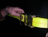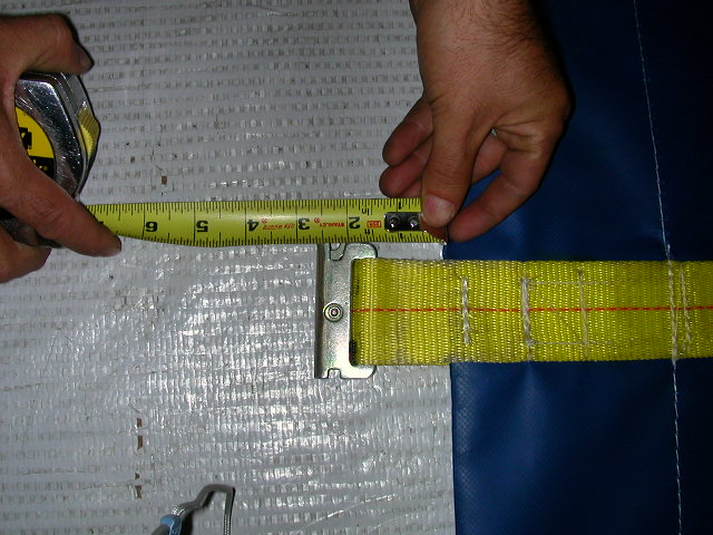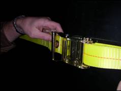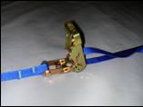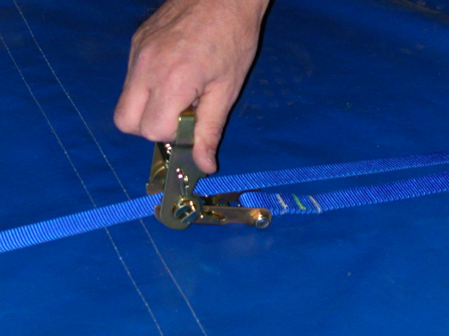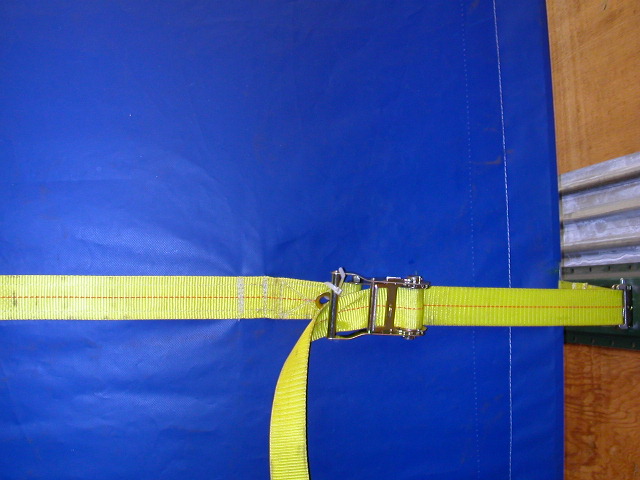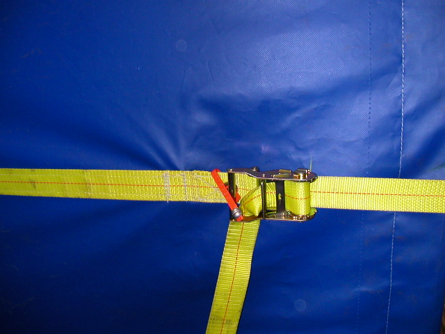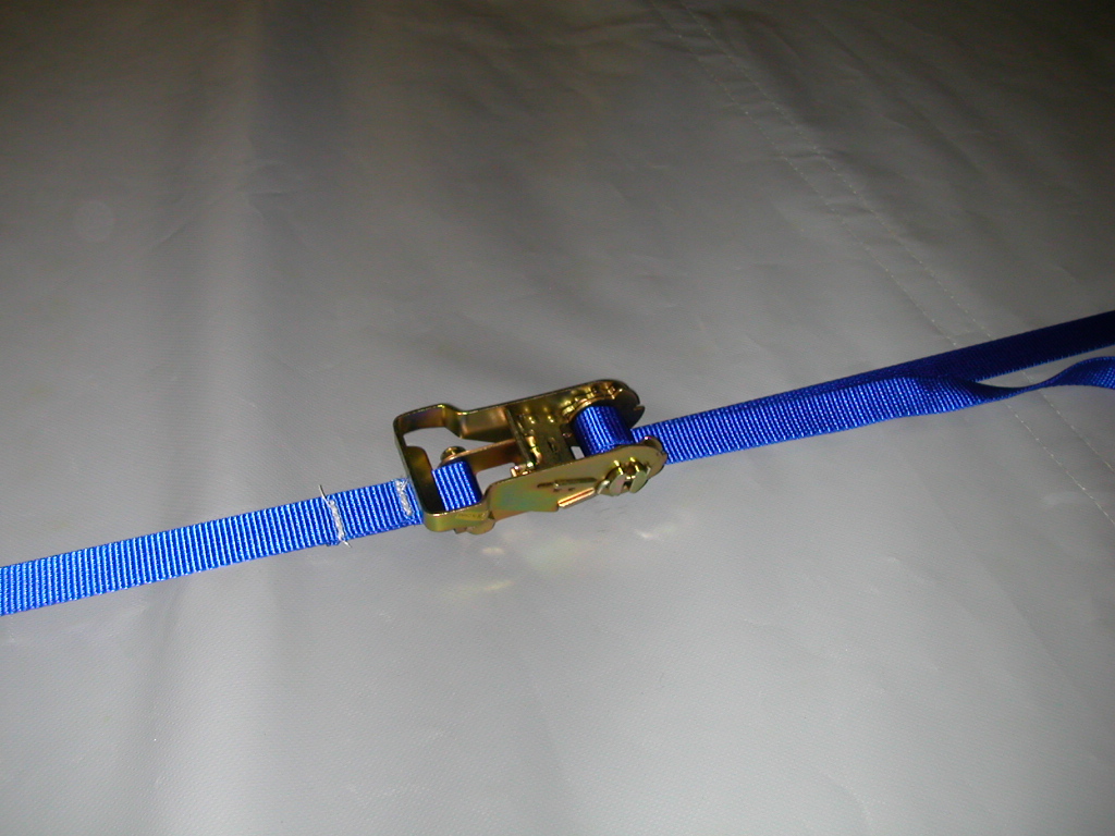 the blue 1” webbing strap from the welded D-ring through the ratchet.