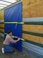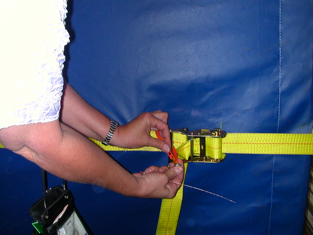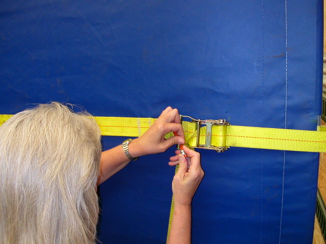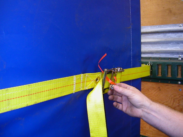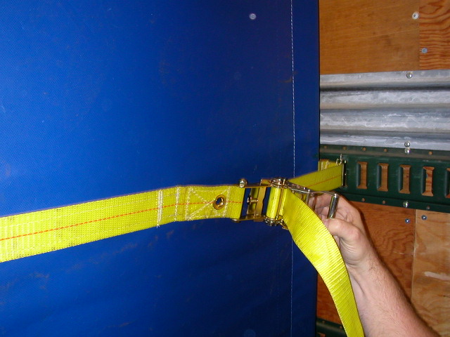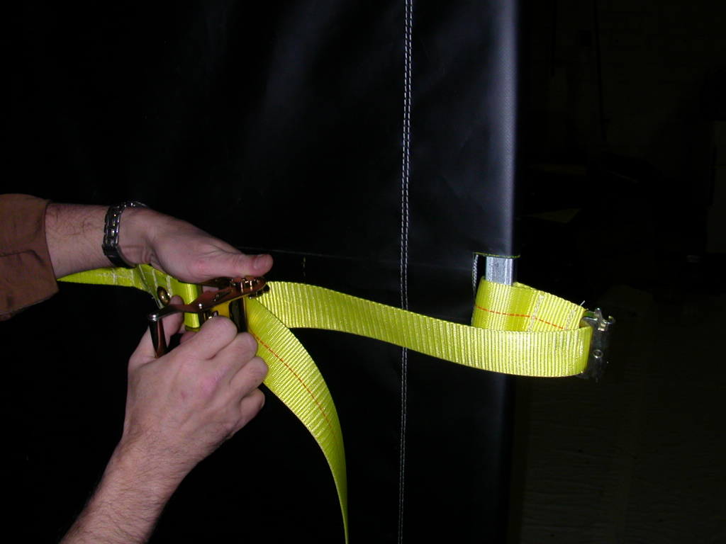 inserting the curbside E-clips, then ratcheting tight. The curtain is then made tamper